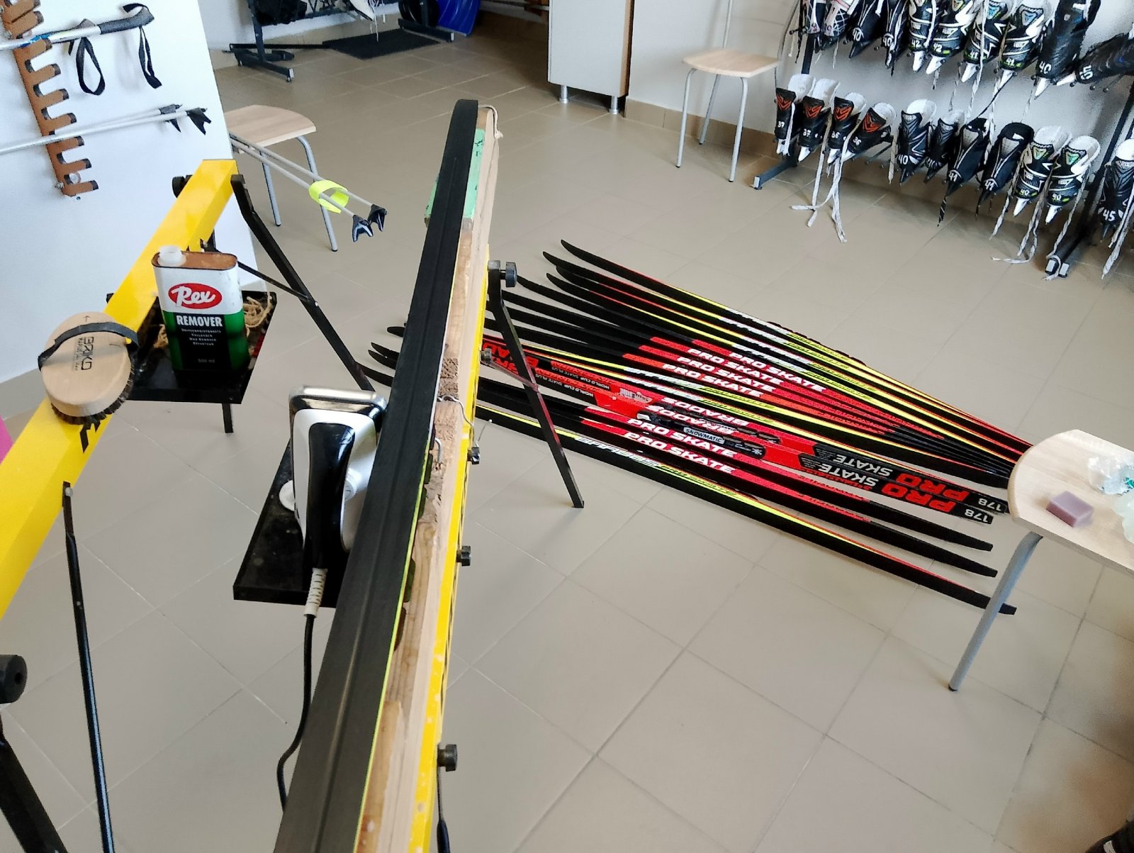 Ребята тщательно почистили скользящую поверхность специальной лыжной смывкой, с помощью металлической щётки вычистили структуру, а затем нанесли защитный парафин с помощью утюга. Такой уход предотвращает окисление и сохраняет лыжи в отличном состоянии.